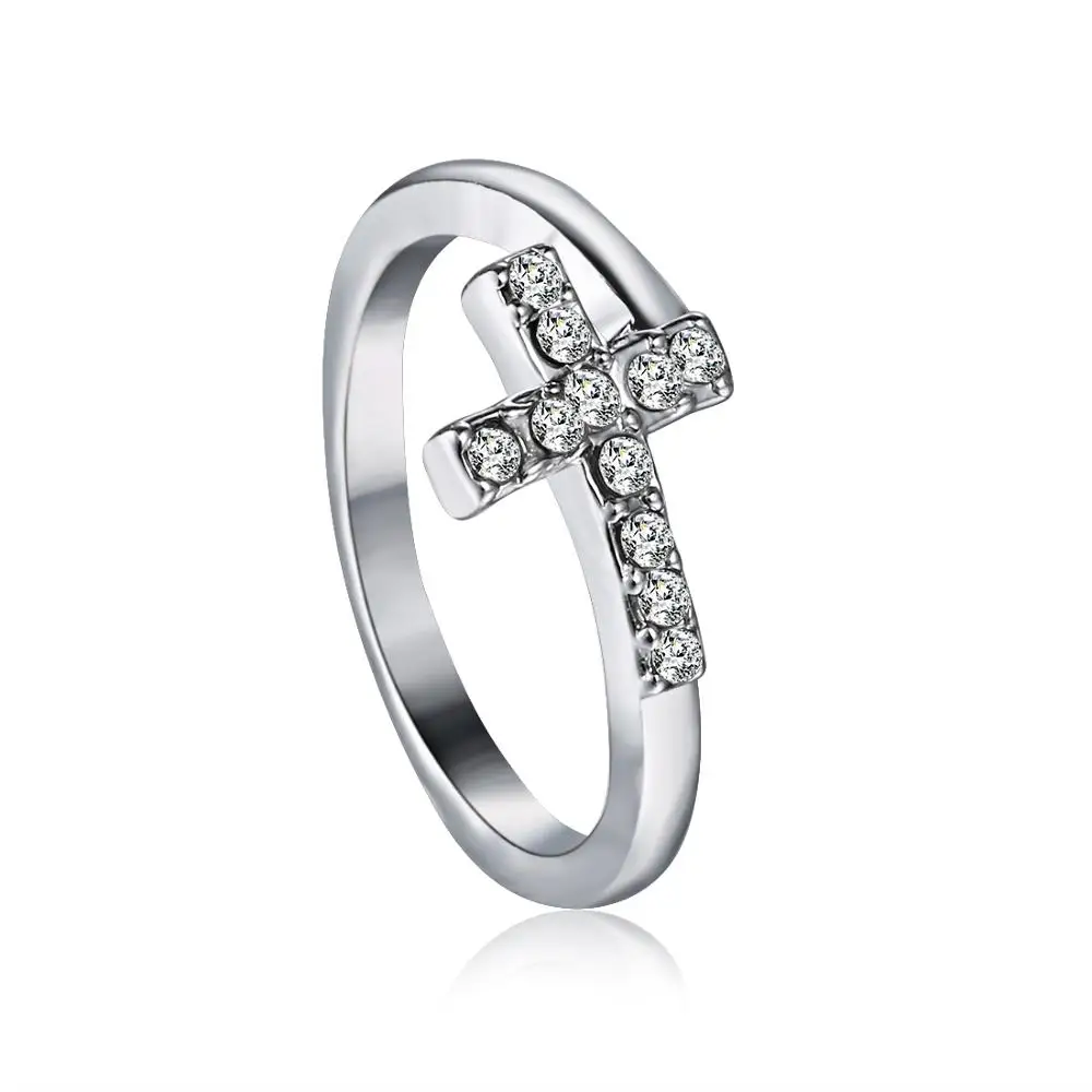 1PC Silver Color Alloy Cross Heart Rhinestone Mosaic Opening Ring Simple Round Single Row Zircon Rings Fashion Party Jewelry