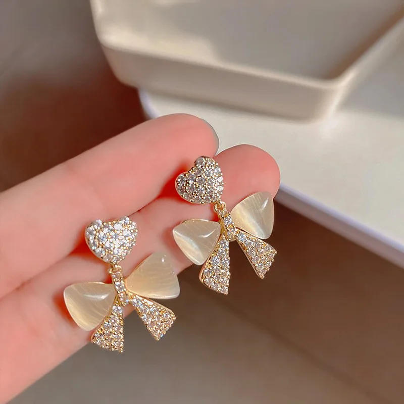 2023 New Cute Heart Bow Stud Earrings For Women Korean Fashion Shiny Zircon Opal Earrings Sweet Party Jewelry Birthday Gifts