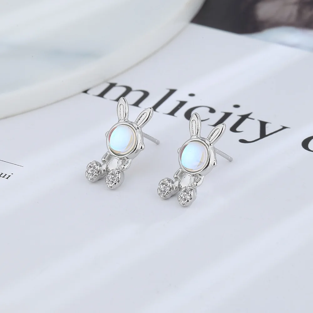 Korean Trendy Simple Sweet Zircon Imitation Jade Cute Rabbit Stud Earrings For Women Shiny Silver Plated Fashion Amulet