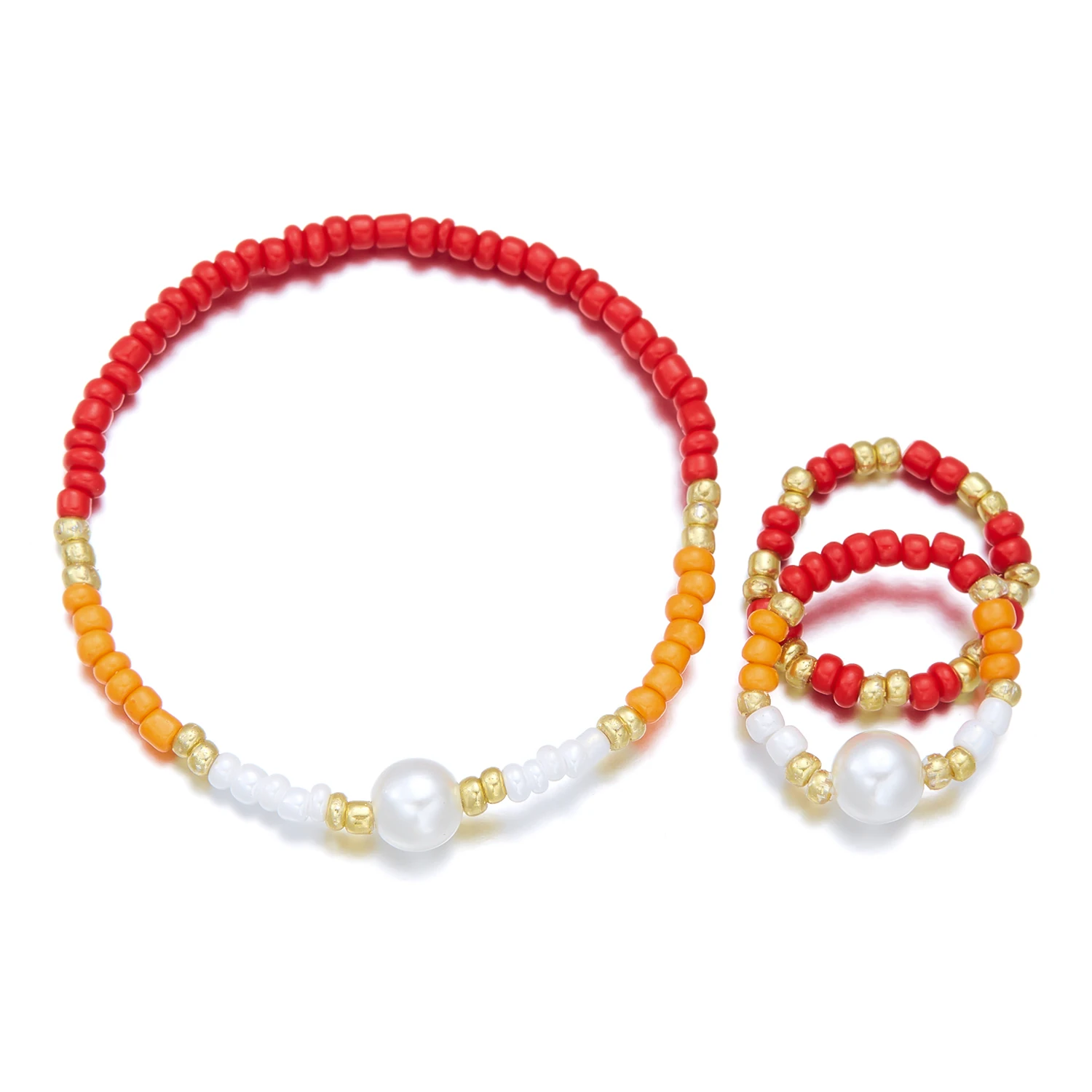 3 PCS/Set Colorful Rice Beads Pearl Bracelet Ring For Women Girls Bohemian Elastic Rope Summer Beach Jewelry Wrist Finger Gifts