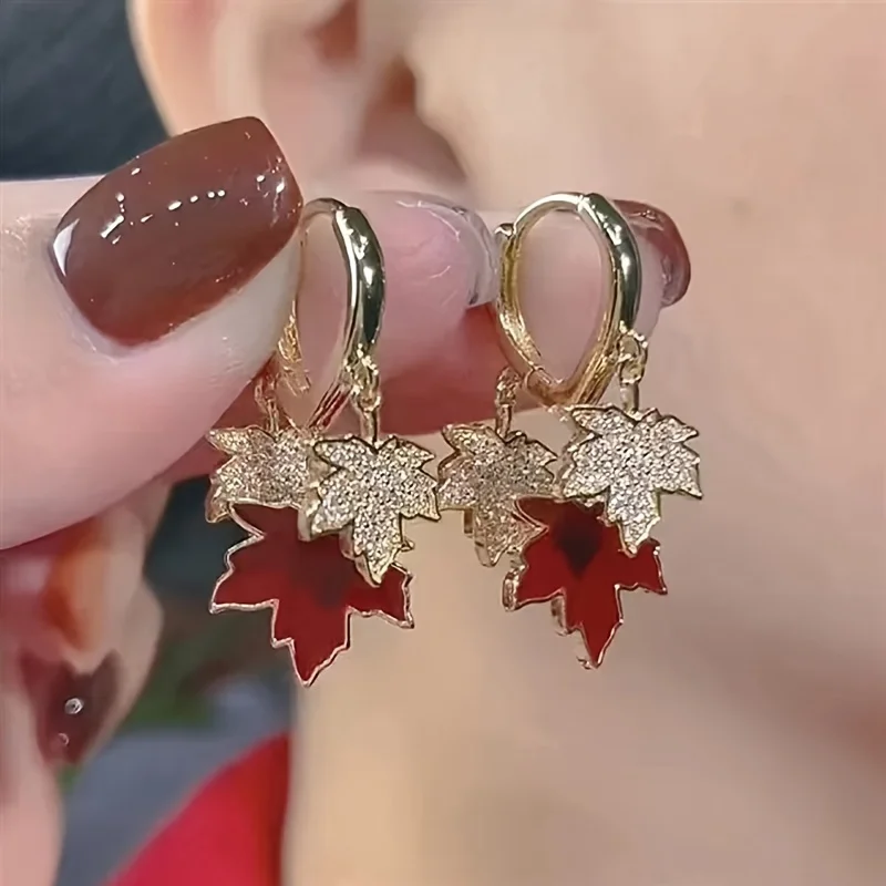 Creative Red Maple Leaf Zircon Stud Earrings For Women Cute Animal Rabbit Cat Rhinestone Earring Girls Christmas Party Jewelry