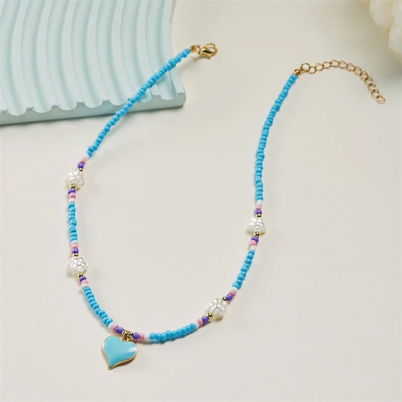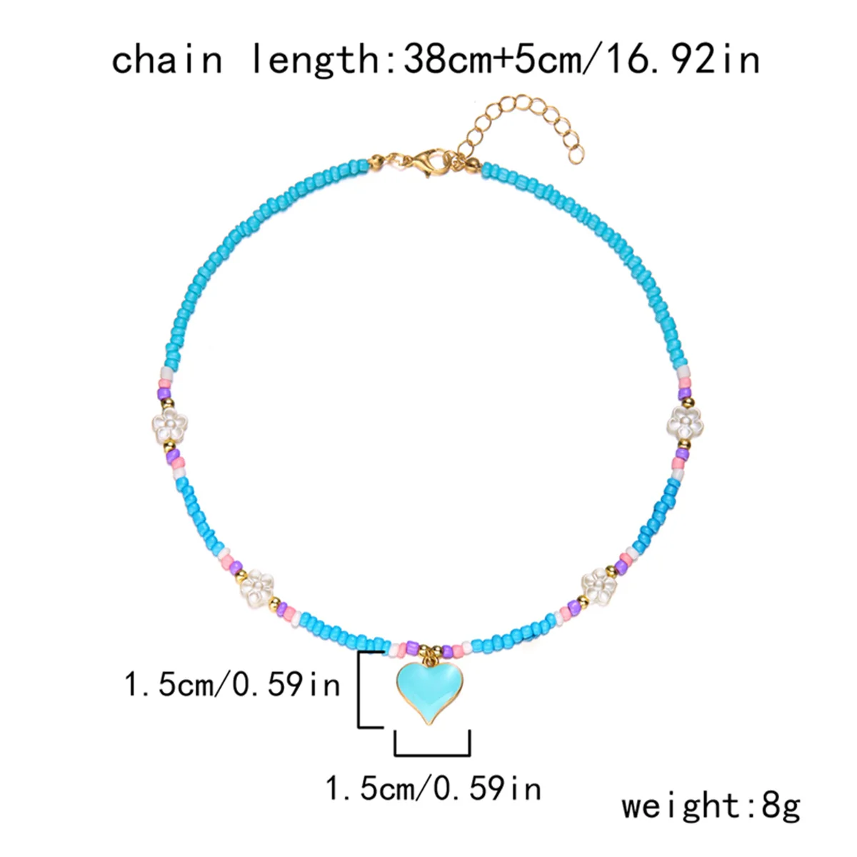 Bohemian Colorful Rice Beads Flower Necklace for Women Sweet Cute Enamel Love Heart Pendant Anklets Summer Jewelry Birthday Gift