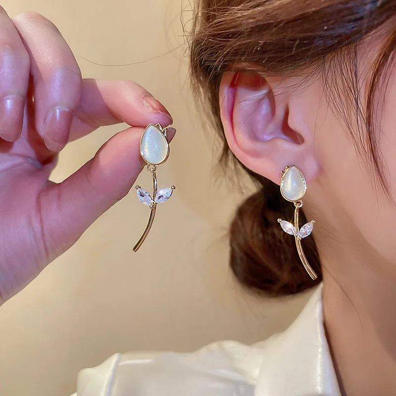 Korean Tulip Flower Zircon Drop Earrings For Women Girls Sweet Temperament Opal Earrings Wedding Party Jewelry Unusual Gift