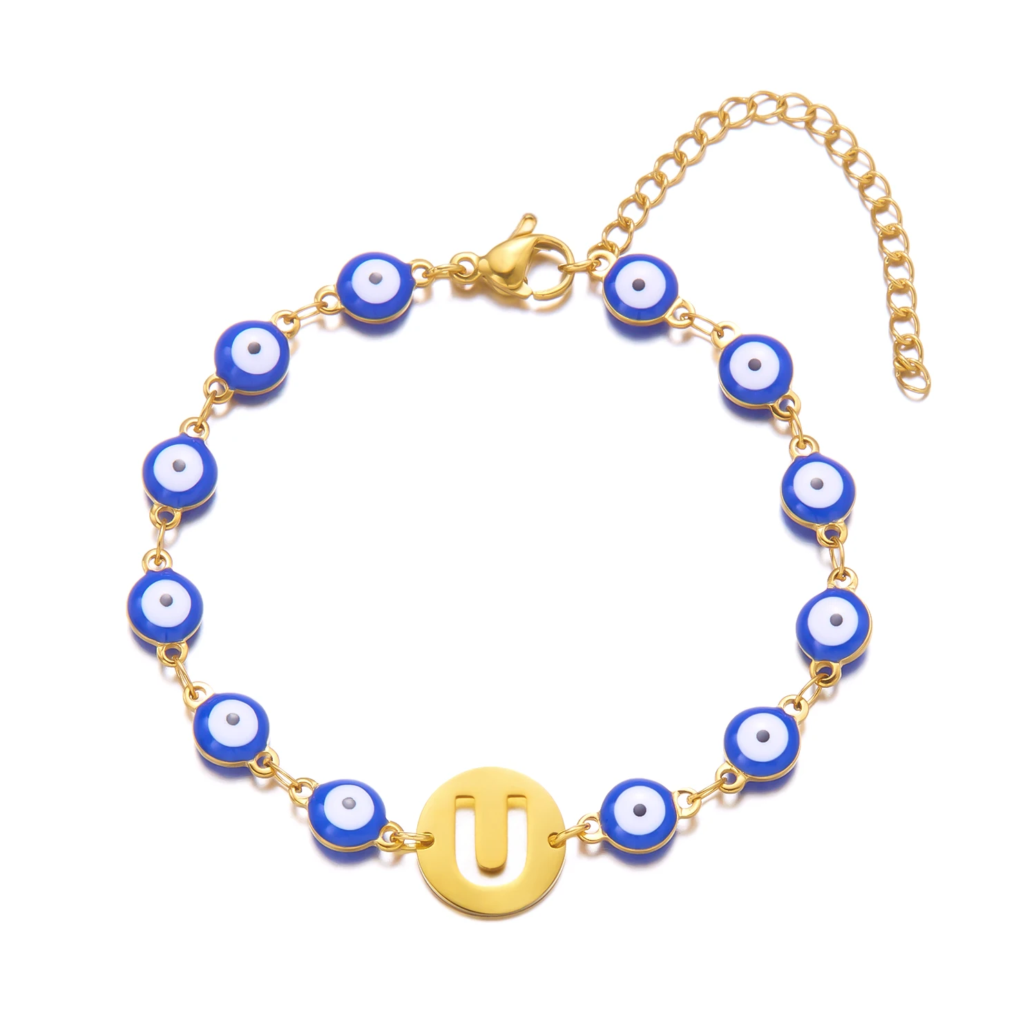 New 26 Letters Initial Evil Eye Bracelet for Women Men Couple Blue Lucky Turkish Jewelry Steel Chain Friends Birthday Wrist Gift