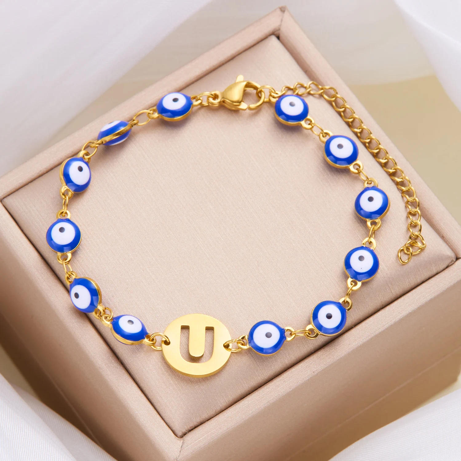 Lucky Turkish Blue Evil Eye Bracelet for Women Men Exquisite Stainless Steel A-Z Initial Name Bracelet Friendship Jewelry Gifts