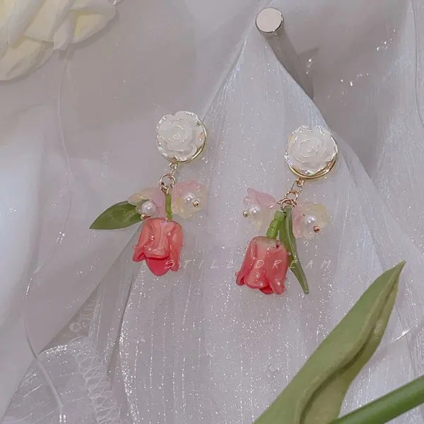 Pink Tulip Imitation Pearl Earrings Rose Flower Ear Studs for Women Daily Wear Ear Piercings Jewelry Gifts Spring Accessories