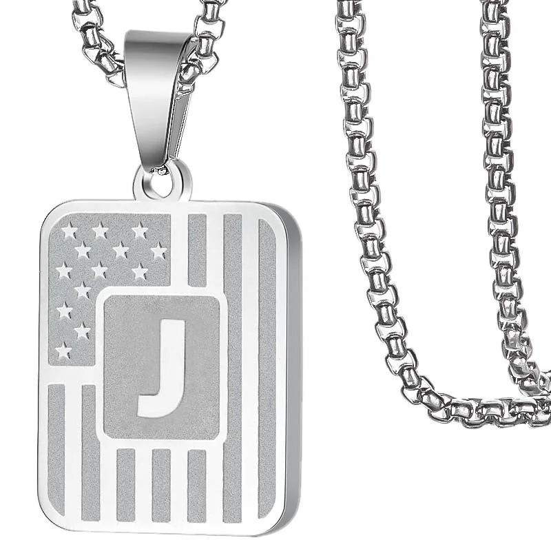 American Flag 26 Letter Square Pendant Necklace for Men Women Stainless Steel Silver Color Choker Jewelry Birthday Name Gifts