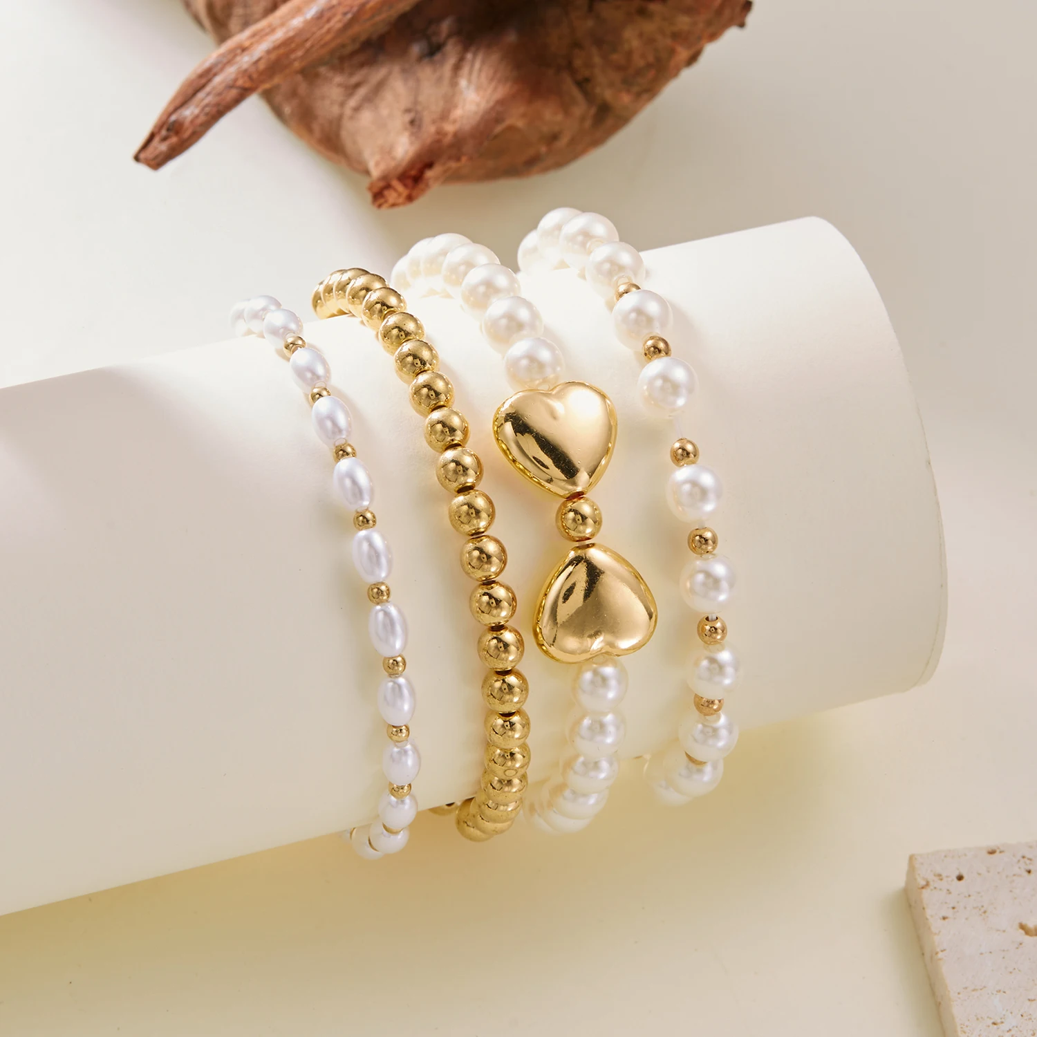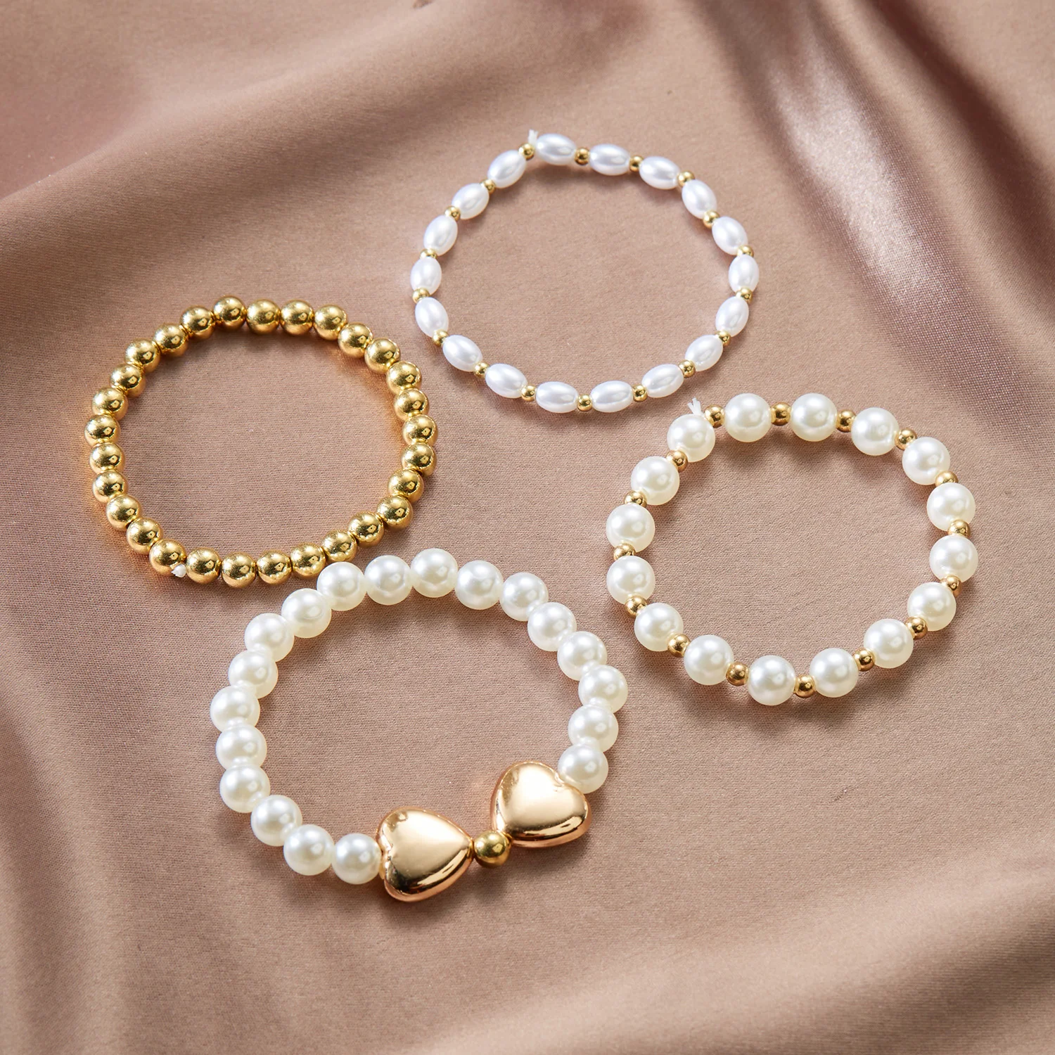 4pcs Vintage White Imitation Pearl Beads Bracelet Set For Women Bohemian Flower Love Heart Enamel Beaded Cuff Bangle Jewelry