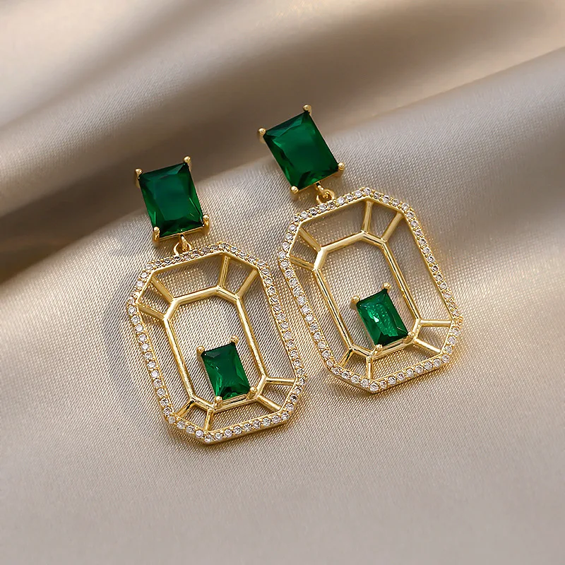Korean Vintage Temperament Geometric Green Crystal Drop Earrings For Women Unusual Earrings New Joker Banquet Party Jewelry
