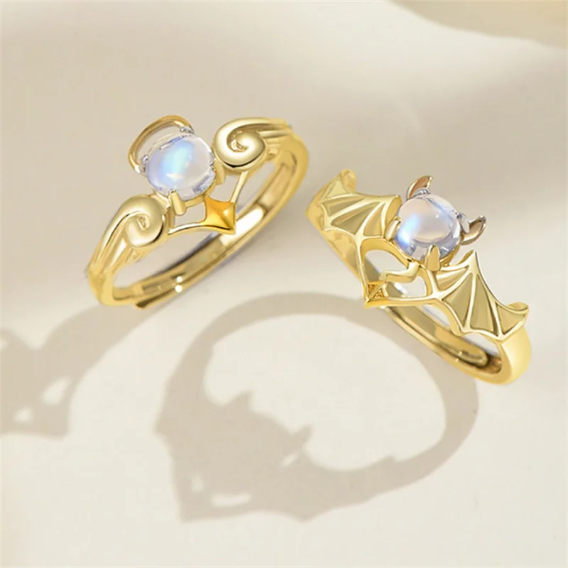 Couple Moonstone Ring for Women Men Trendy Gold Color Angel Demon Adjustable Opening Finger Ring Minimalist Lovers Jewelry Gift