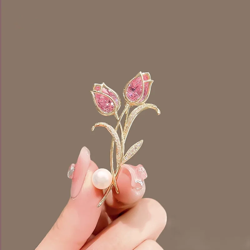 Exquisite Rhinestone Tulip Flower Brooch Women Elegant Pearl Crystal Leaf Floral Lapel Pins Luxury Corsage Jewelry Accessories