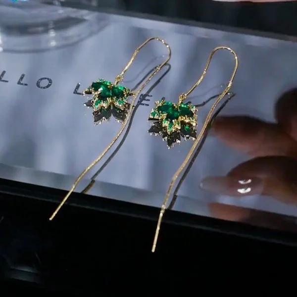 Vintage Rhinestone Red Green Maple Leaf Earrings for Women French Temperament Crystal Tassel Earrings Party Jewelry Bijoux Gift