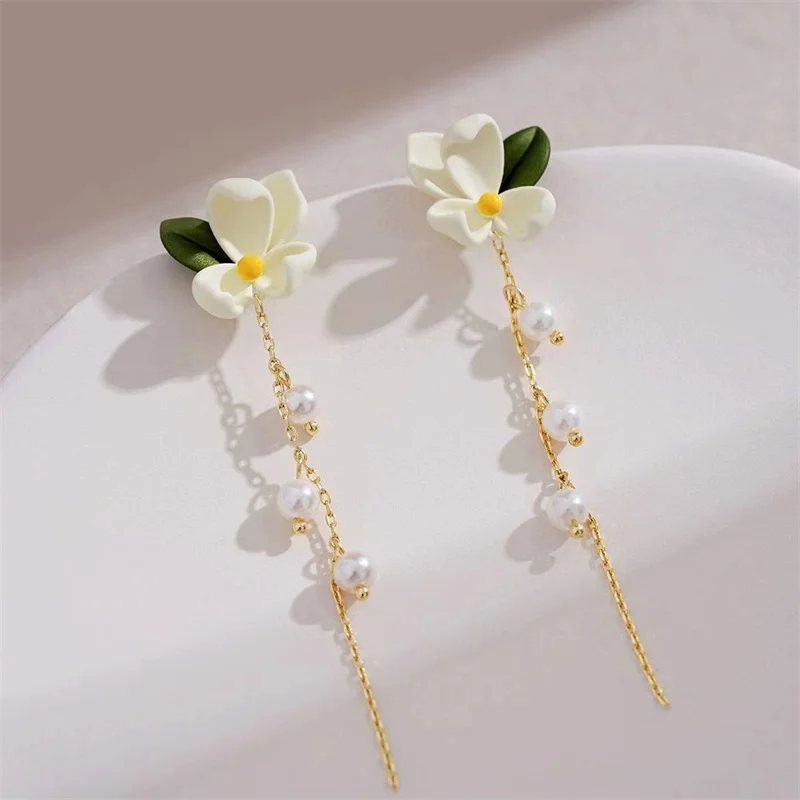 Korean Pearl Tassel Gardenia Stud Earrings for Women Flower Leaf Earrings Wedding Party Jewelry Modern Women's Earrings 2023