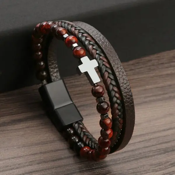 Vintage Leather Bracelet Cross Charm Multilayer Tiger Eye Natural Stone Bead Bracelet Men's Punk Braided Wrap Wristbands Jewelry