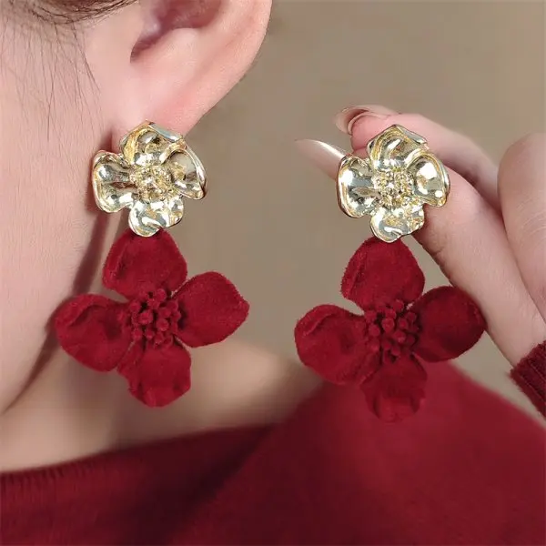 Vintage Dripping Oil Wine Red Retro Stud Earrings For Women Korean Pearl Flower Heart Shape Geometric Earring High Sense Jewelry