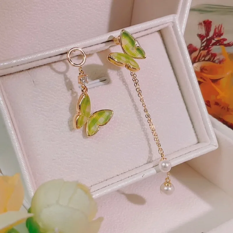 Korean Fashion Cat Rose Flower Tassel Drop Earrings For Women Crystal Pearl Dangle Asymmetrical Wedding Party Jewelry Sweet Gift