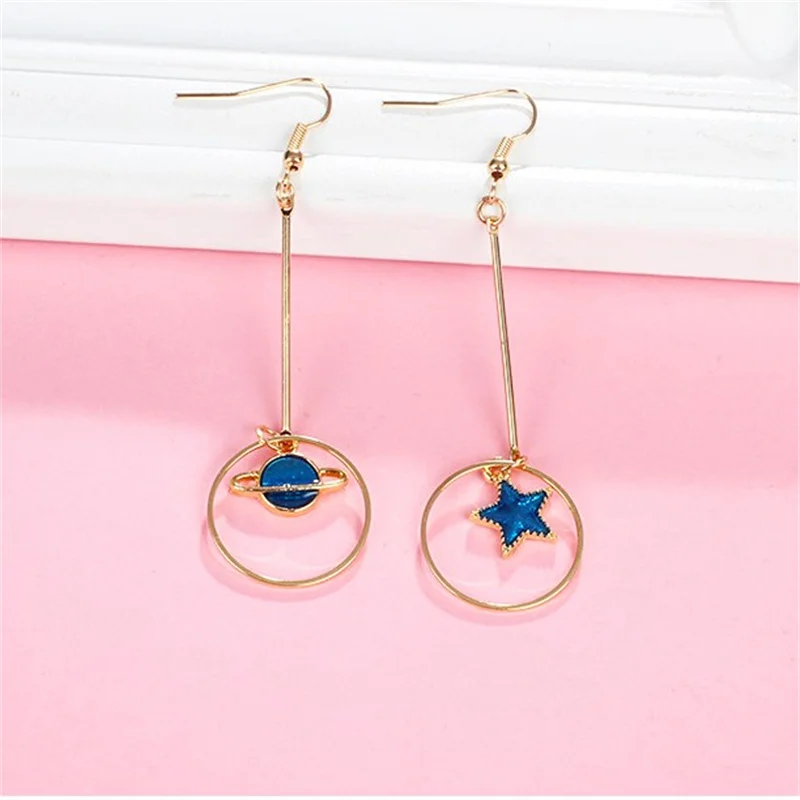 New Fashion Star Moon Earrings For Women Blue Space Universe Starry Planet Long Tassel Asymmetric Earrings Jewelry