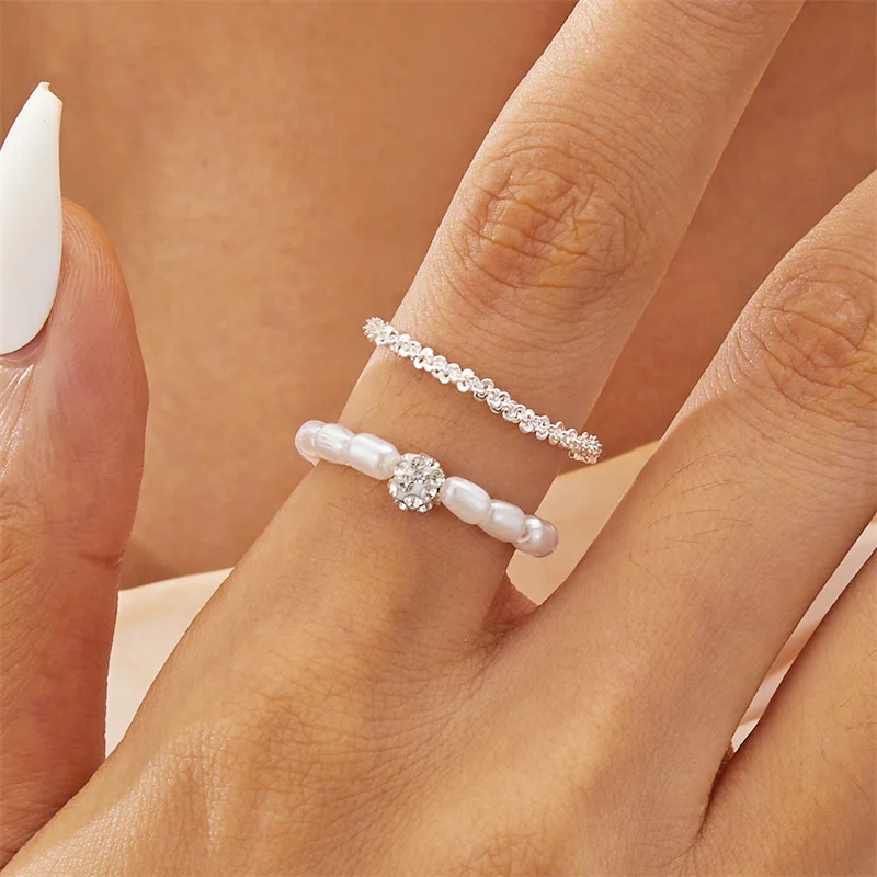 2pcs/set Imitation Pearl Beaded Rings for Women Simple Charm Elastic Finger Ring Wedding Party Jewelry Girls Fine Gift Wholesale