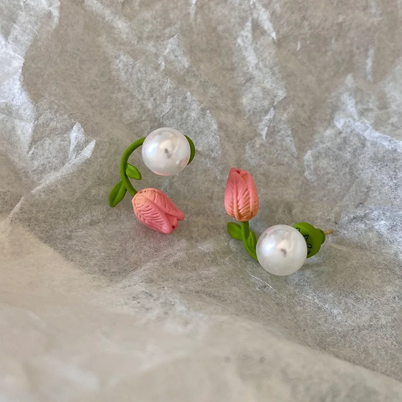 French Tulip Flower Pearl Stud Earrings for Women Exquisite Light Luxury Flower Heart Earrings Women's Earrings 2023 Jewelry
