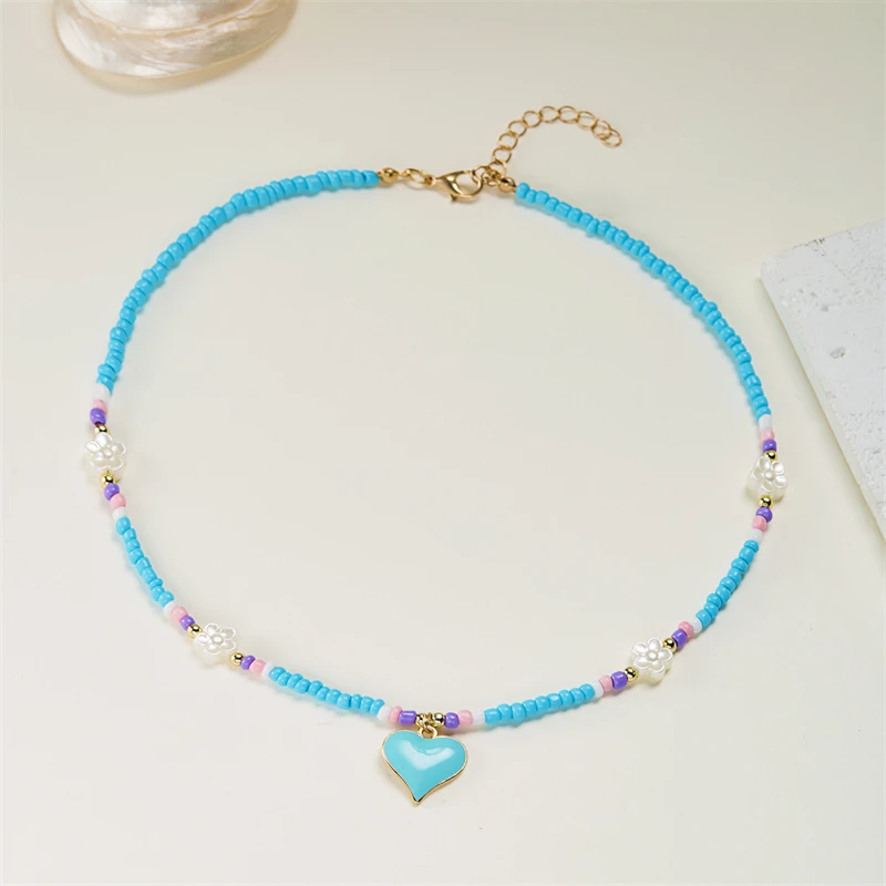 Dopamine Color Love Heart Flower Rice Bead Necklace for Women Simple Fashion 2024 New Collarbone Chain Sweet Cute Jewelry