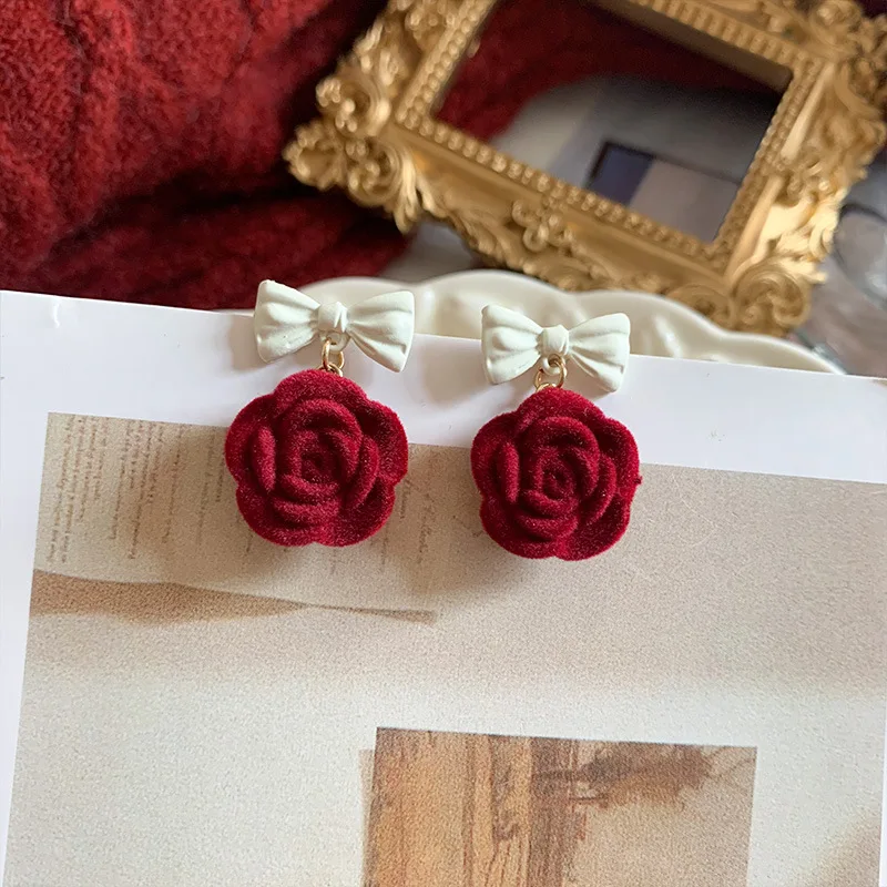 Vintage Red Rose Flower Flocking Stud Earrings For Women Korean Cute Butterfly Pendant Pearl Earrings Wedding Party Jewelry