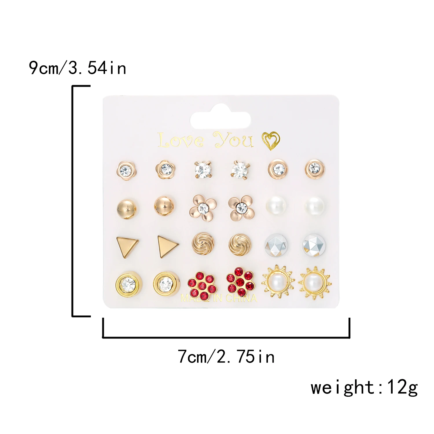 12 Pairs Pearls Rose Flower Earrings Set For Women Bow Star Moon Round Bead Earrings Fashion Rhinestone Jewelry Wedding Travel