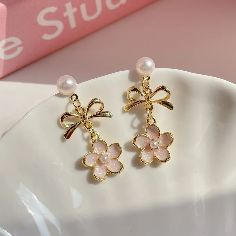 Sweet Pink Cherry Blossoms Drop Earrings for Women Korean Romantic Flower Waterdrop Earrings Girls Party Wedding Jewelry
