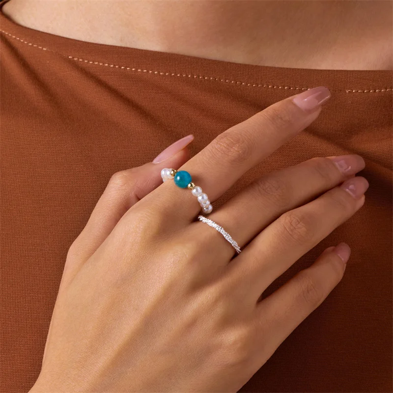 2Pcs/Set Light Luxury Sparkling Metal Chain Imitation Pearl Beaded Rings For Women Minimalist Resin Beads Ring Aesthetic Jewelry