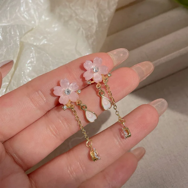 Sweet Pink Cherry Blossoms Drop Earrings for Women Korean Romantic Flower Waterdrop Earrings Girls Party Wedding Jewelry