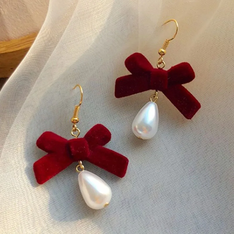 Vintage Imitation Pearl Bowknot Drop Earrings for Women Handmade Beads Long Hanging Earrings Girls Party Wedding Jewelry Gift
