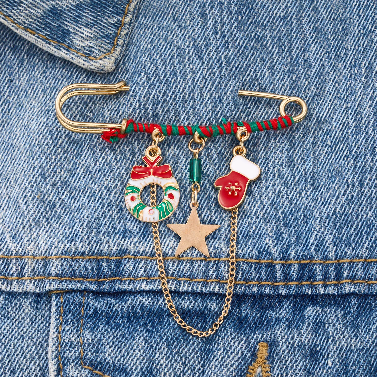 Christmas Long Pins Star Tassel Chain Brooch Xmas Tree Glove Wreath Gift Box Elk Santa Claus Brooches for Women Kid Coat Jewelry