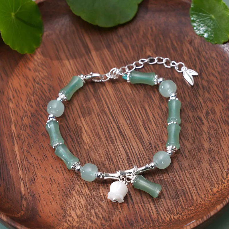 Chinese Style Green Bamboo Joint Beaded Bracelet for Women Minimalist Flower Tassel Handmade Bracelet Friendship Jewelry Gift
