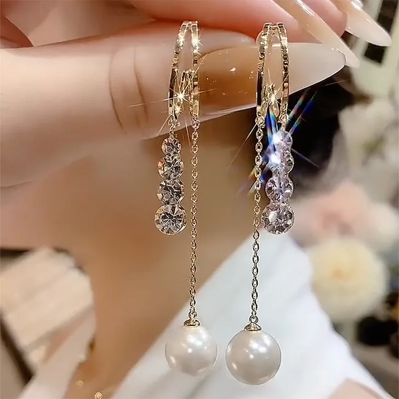 Trend Gold Color C Shape Pearl Zircon Tassel Earrings For Women Korean Personality Unique Earrings Wedding Jewelry Birthday Gift