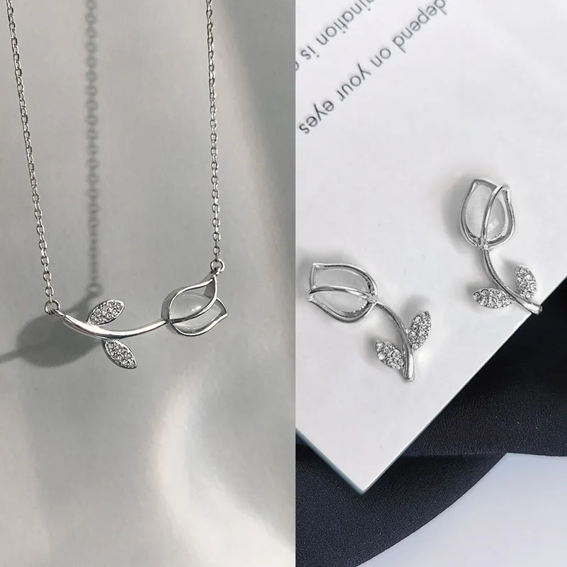 Romantic Pink Cherry Blossom Clavicle Chain Jewelry Set For Women Elegant Sweet Rose Flower Necklace Earrings Set Wedding Gift
