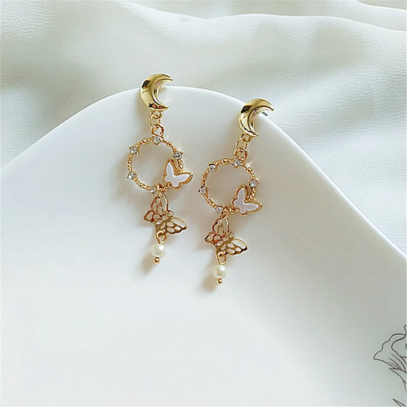 Kpop Shiny Zircon Hollow Butterfly Drop Earrings For Women Korean Imitation Pearls Long Tassel Dangle Earrings Wedding Jewelry